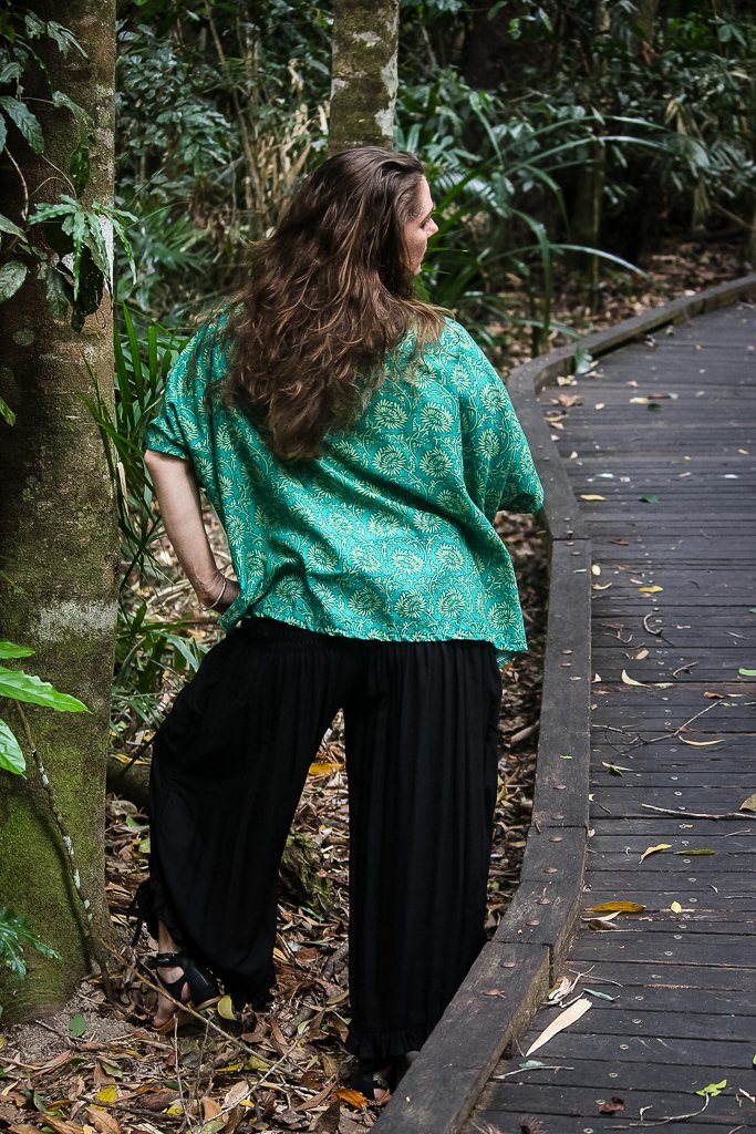 Relaxed fitting, funky and free flowing. Our " Passport " pants will have you travelling with ease, comfort and style whether just in your day to day or worldwide . Soft shirring on the waist, deep pockets and a loose generous fit with a tie bottom will make this a first class choice for many women especially the fuller figured. Change the look by loosening off the leg ties and wearing sandals or pulling up high and pairing with boots. Available in an eclectic range of colours and patterns as well as a plain black or white option.