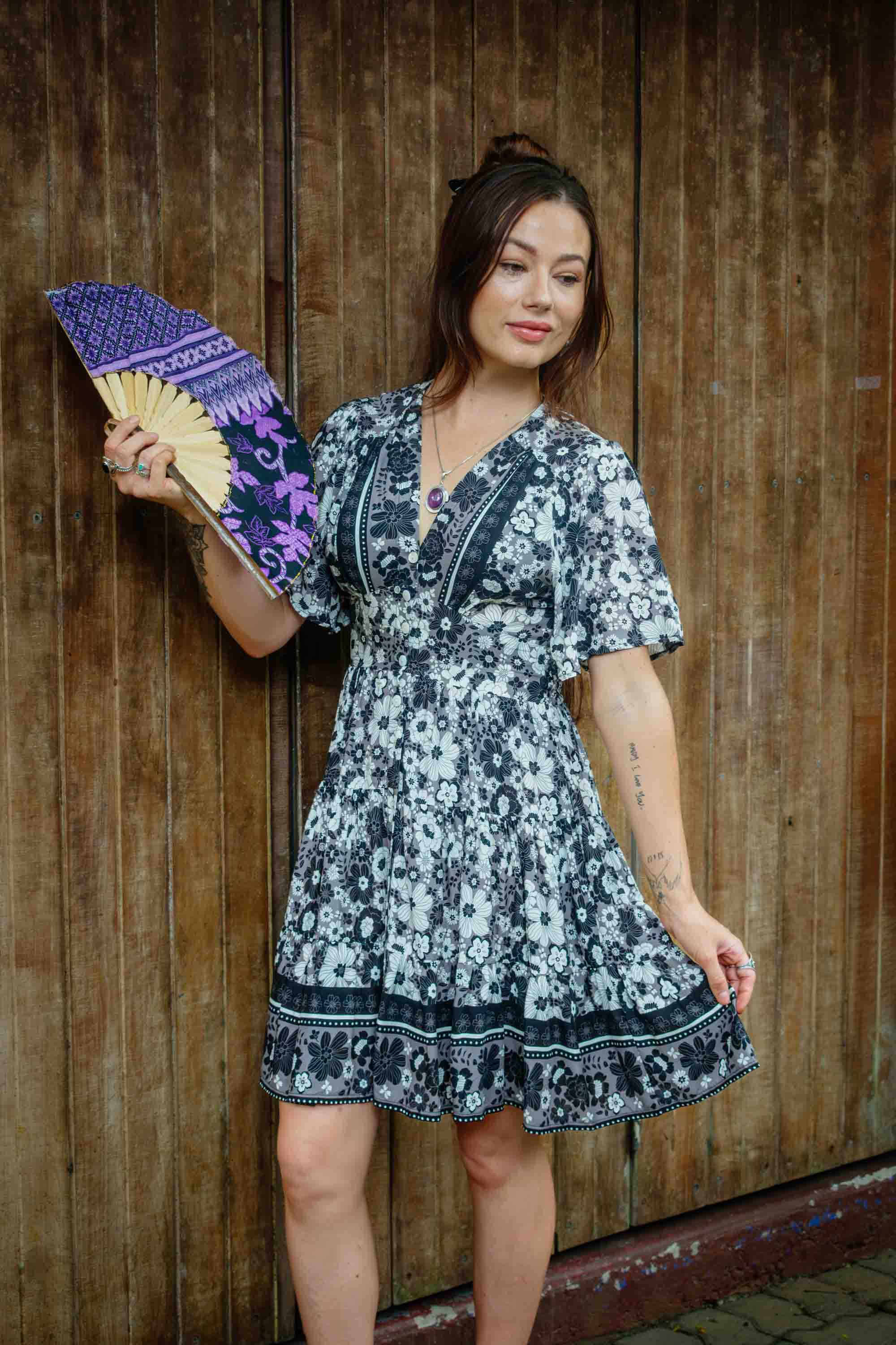 Elegant, cool, and effortlessly refined, our Gaia Short Dress – Grey Poppy brings chic simplicity to warm-weather dressing. Designed in a beautifully tailored silhouette, it features a harmonious blend of Black, White, and soft Grey in a subtle floral Poppy print. Made from silky feeling high-quality Rayon, this short, polished frock includes pockets, lustrous shell buttons, and an elasticised back for comfort. Perfect with White sneakers for casual days or elevated with accessories for an evening out, it’s the ideal vacay-ready piece for versatile, tasteful style.