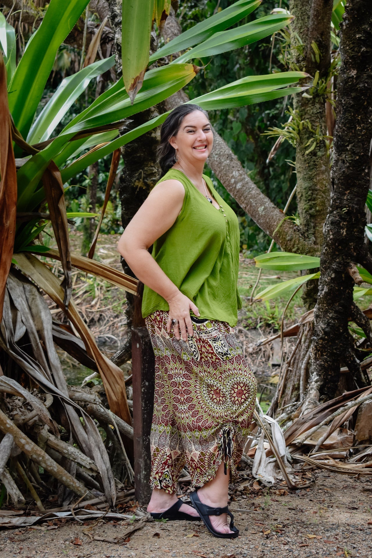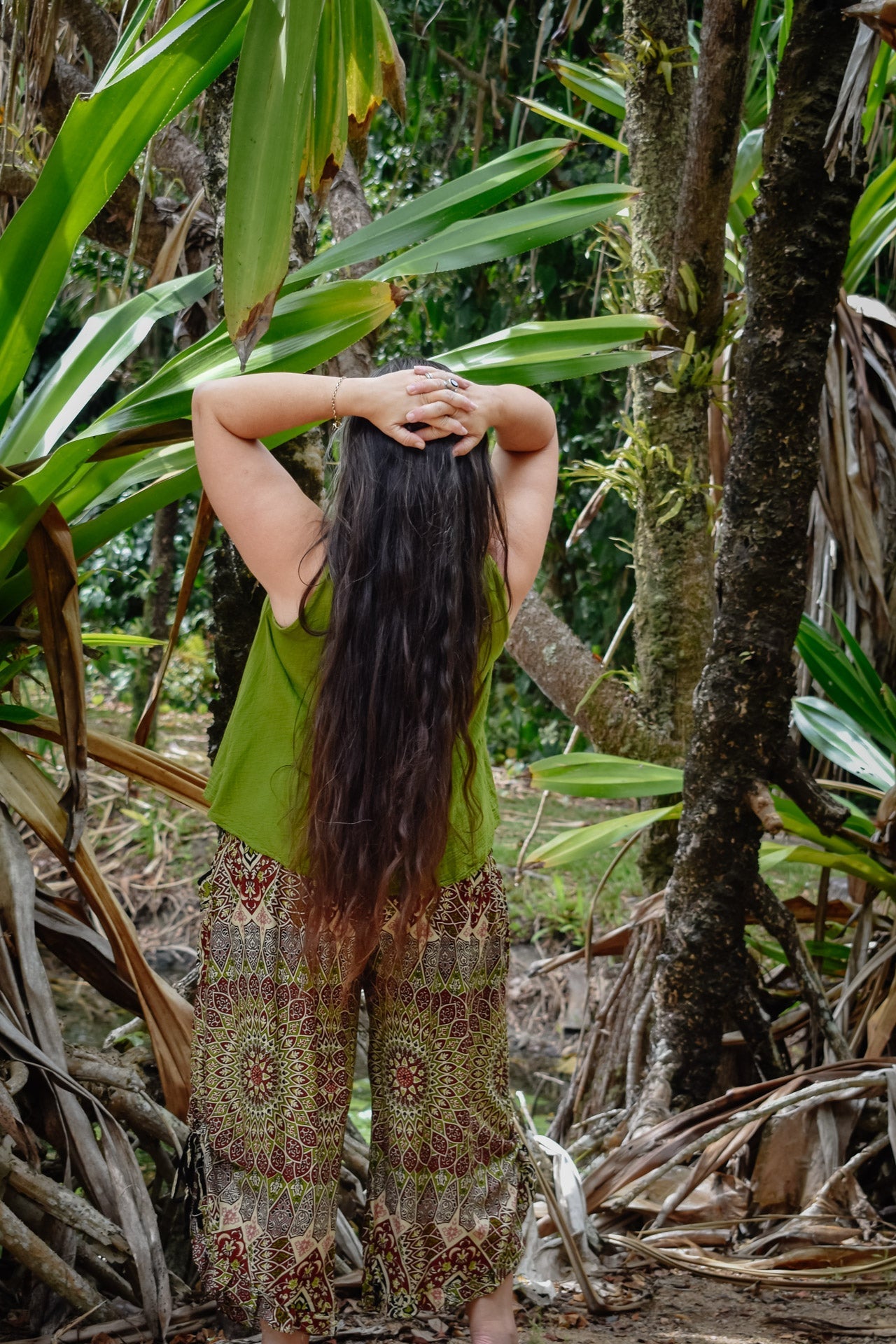 Our casual and travel-friendly "Passport Pants" provide comfort and functionality with a relaxed cut and pouch pockets. They feature frilled, curved cuffs with drawstrings, so they can be worn two ways: flared out or cuffed style. These are particularly great for women with fuller figures being generously cut and flexible fitting. The earthy Mystic Brown print adds a subtle Hippiness to the look and is best teamed with a flowy and natural looking, solid top like our soft cotton "Willow" top as shown here or the lace-bordered "Hope" top for a fancier vibe.