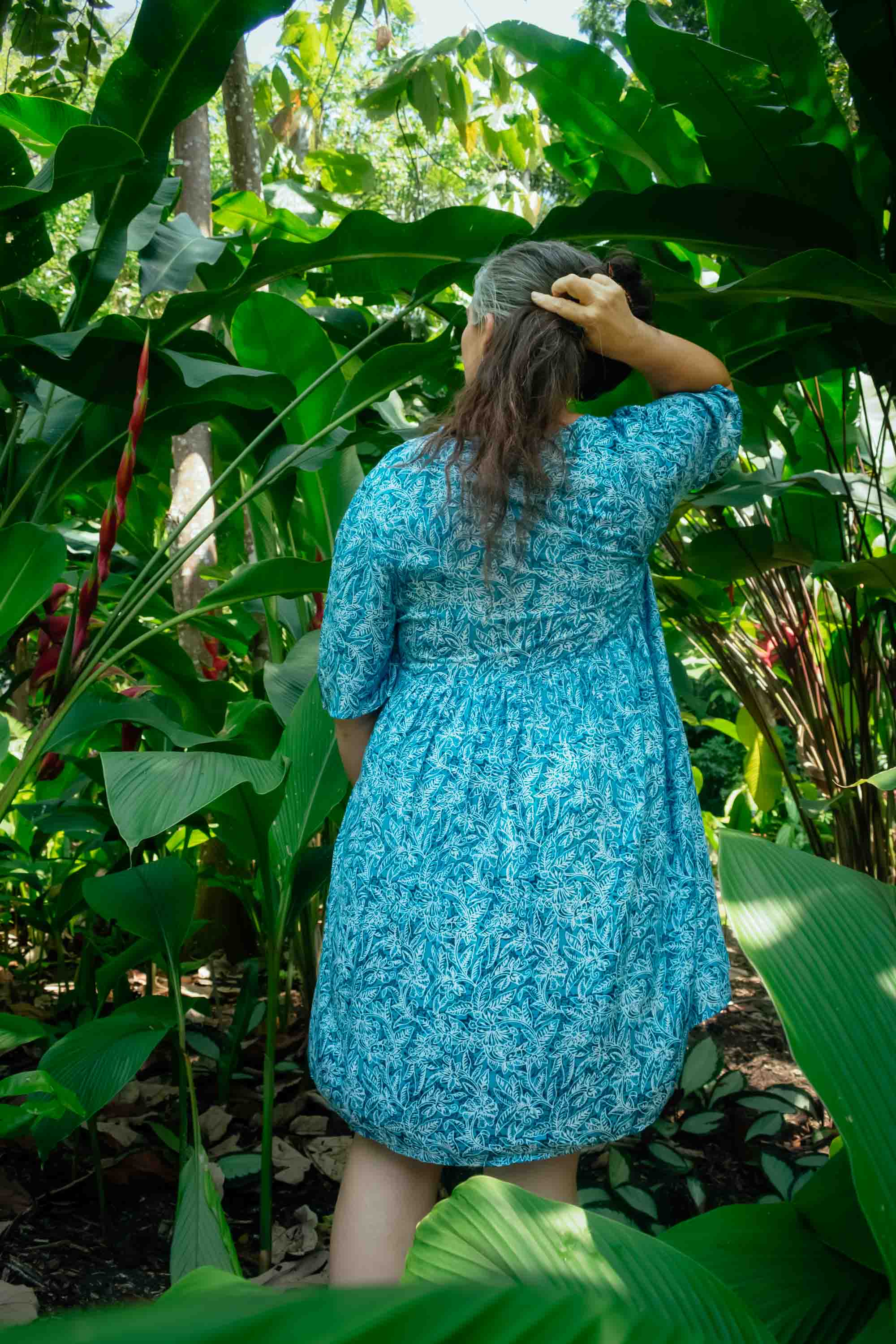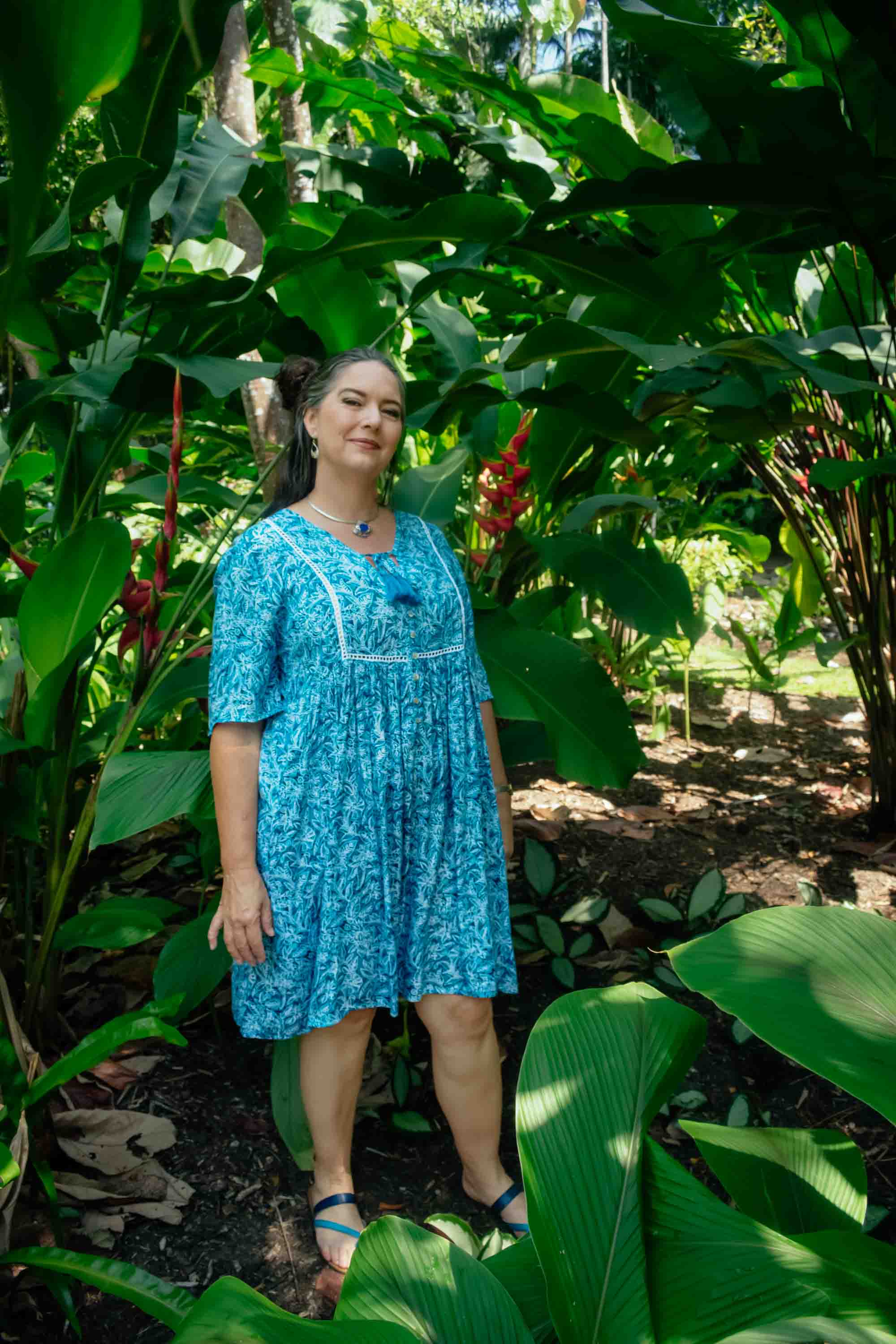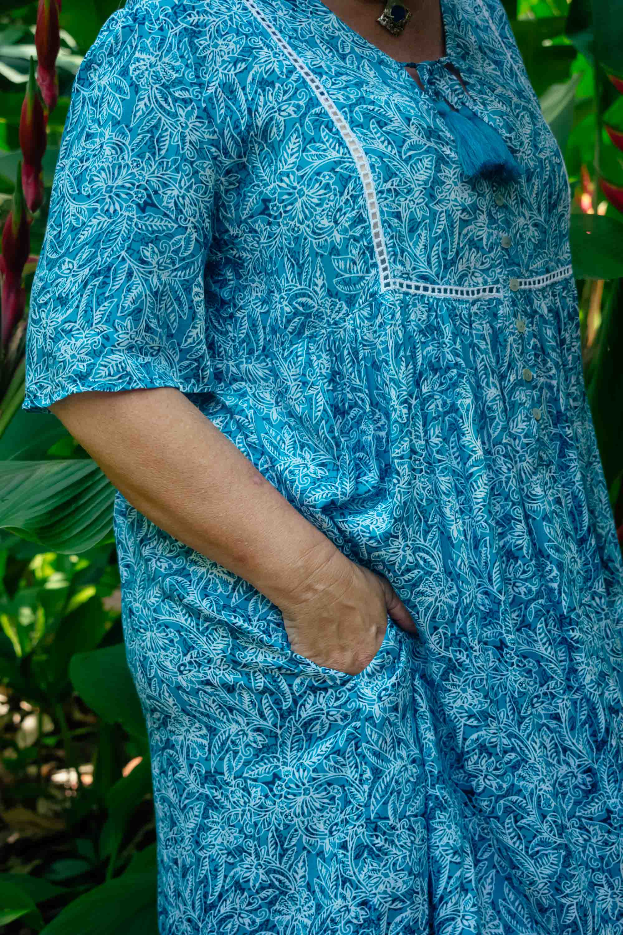 Soft and feminine with a relaxed bohemian charm, the Stellar Short Dress in Teal Batik Floral features a delicate white floral pattern across a rich teal-blue background, creating a subtle batik effect. Made from high quality rayon, it feels cool and breathable, perfect for effortless everyday wear. The empire waistline and gathered skirt offer a flowing silhouette, while the crochet detail and tassel-tie neckline add an artisan touch. With in-seam pockets and a relaxed fit, this lightweight summer dress brings easy elegance to casual days or travel adventures.