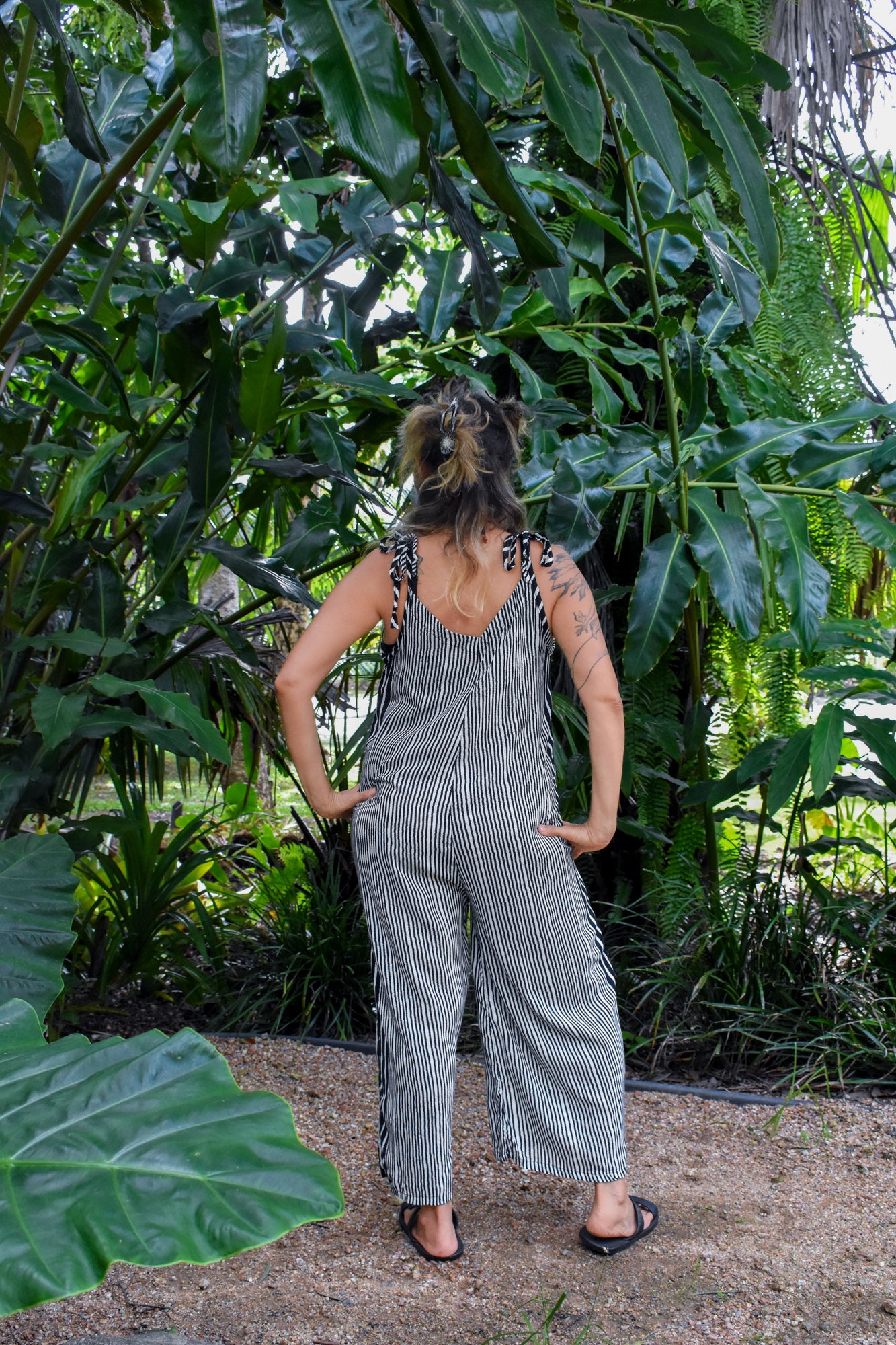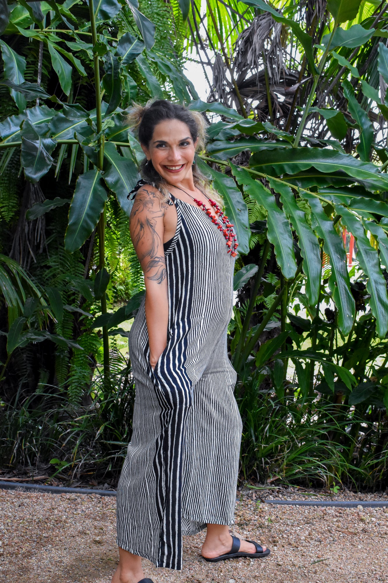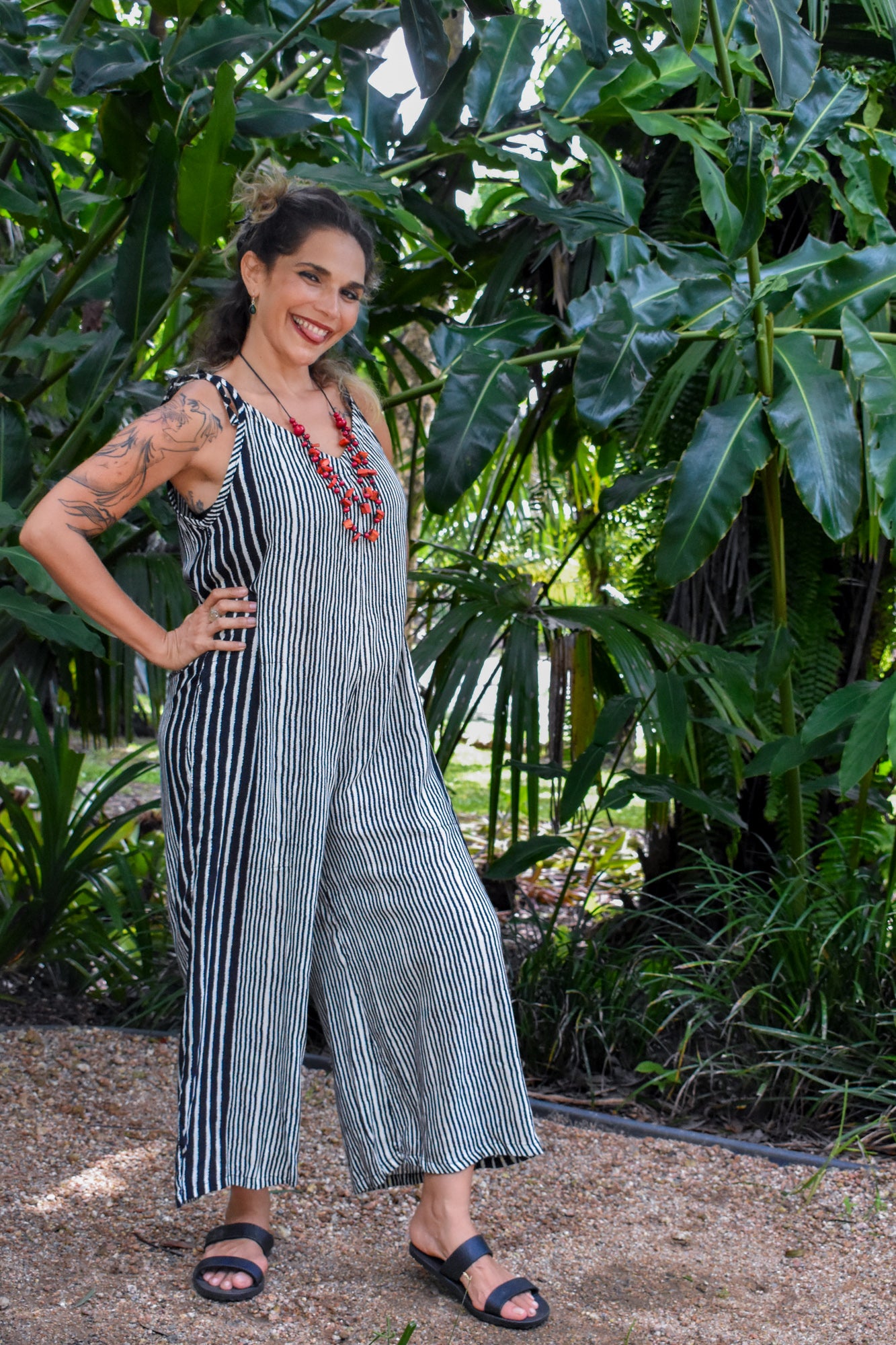 Feel comfortable and look fabulous in our new "Calm Pantsuit” in a super flattering Black classic stripe fabric. Contemporary, chic, and a head turner. The jumpsuit has a relaxed fit with wide legs and side pockets. It is sleeveless with adjustable shoulder straps. This pantsuit has a cool energy that exudes confidence in your own skin. Its relaxed fit is comfortable and suits different body shapes and figures. Give it more character with boho jewellery and fun accessories.
