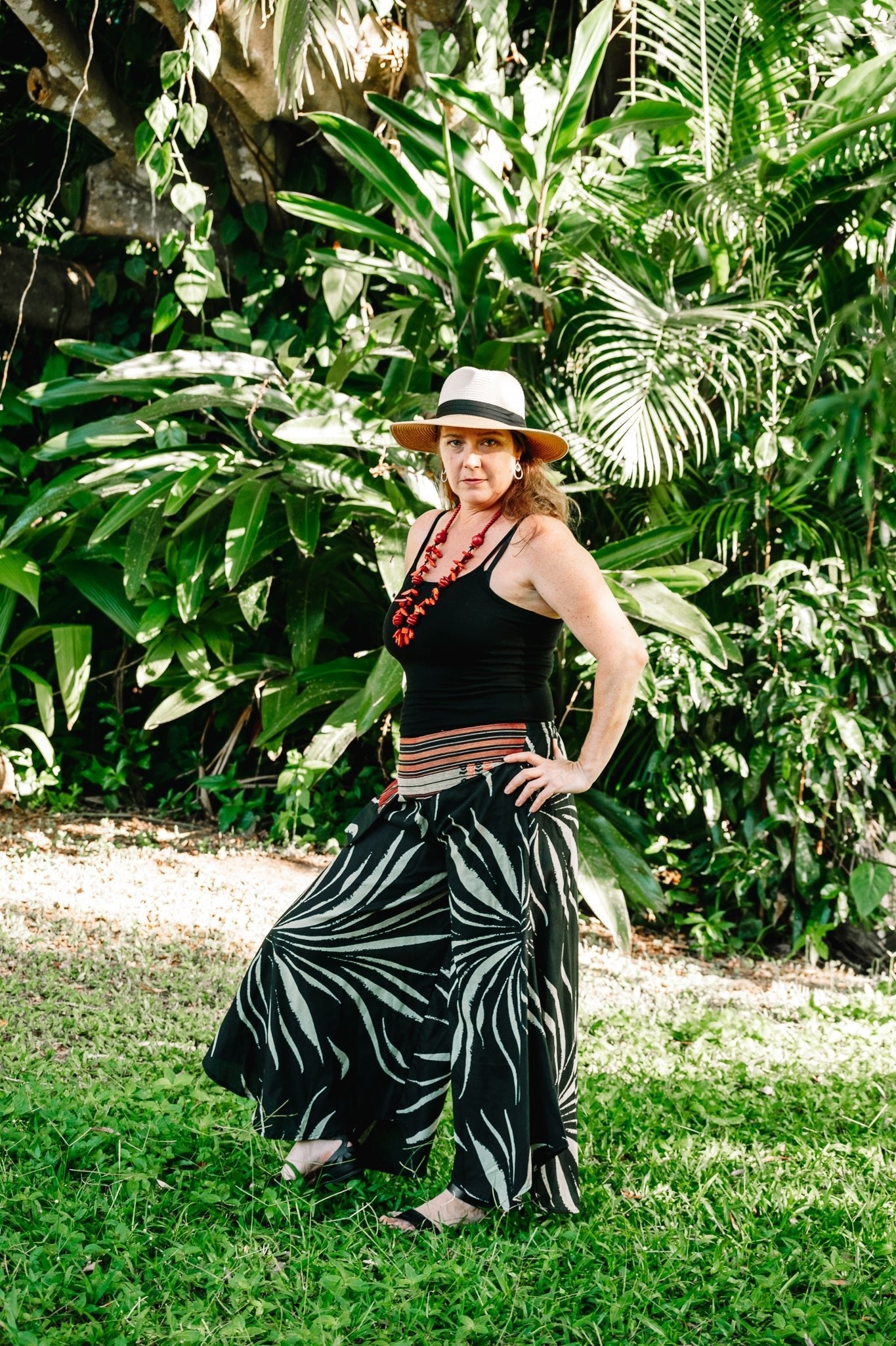 Bold and vivid, our exotic and groovy "Cinnamon” pants are now available in a wonderful, cool and robust, breathable Cotton. Shown here in the dramatic and eye-catching "Burst” print, they are great for travel and dressing up for a distinctive and unique, striking outfit. Sure to elicit admiration. With a generously cut and flattering shape they are completed with an interesting woven waistband with pocket in earthy hues of red, ochre and bone. Team them with a fitted top and textural pop like our "Samsara” range or keep it natural and tribal with our diverse range of gorgeous, crochet cotton like our lush "Jamilla” top. Available in other interesting and fabulous prints and patterns too.