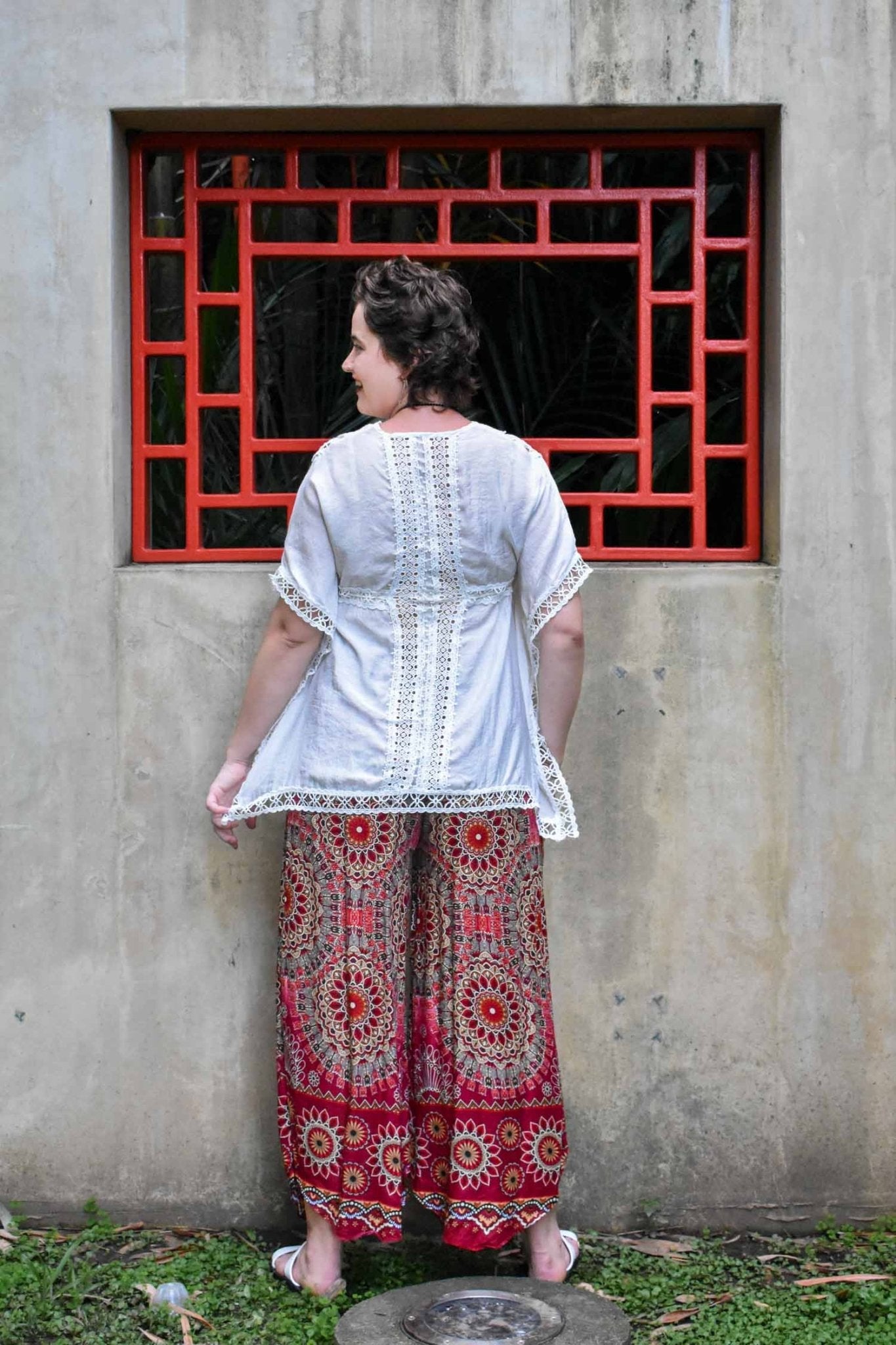 Free spirited and Flowy and seen here in a fiery and warm colour scheme of Maroon and Red hues with tints of Umber, Black and Cream, our "Fern” pants are presented here in a fabulous Geometric Mandala print. They are suitable for all your casual doings and can also be dressed up for a relaxed, casual yet elegant chic look as seen here, with our new beautiful Boho"Izzy” top. Cool and comfortable wearing they are great for all ages and styles.