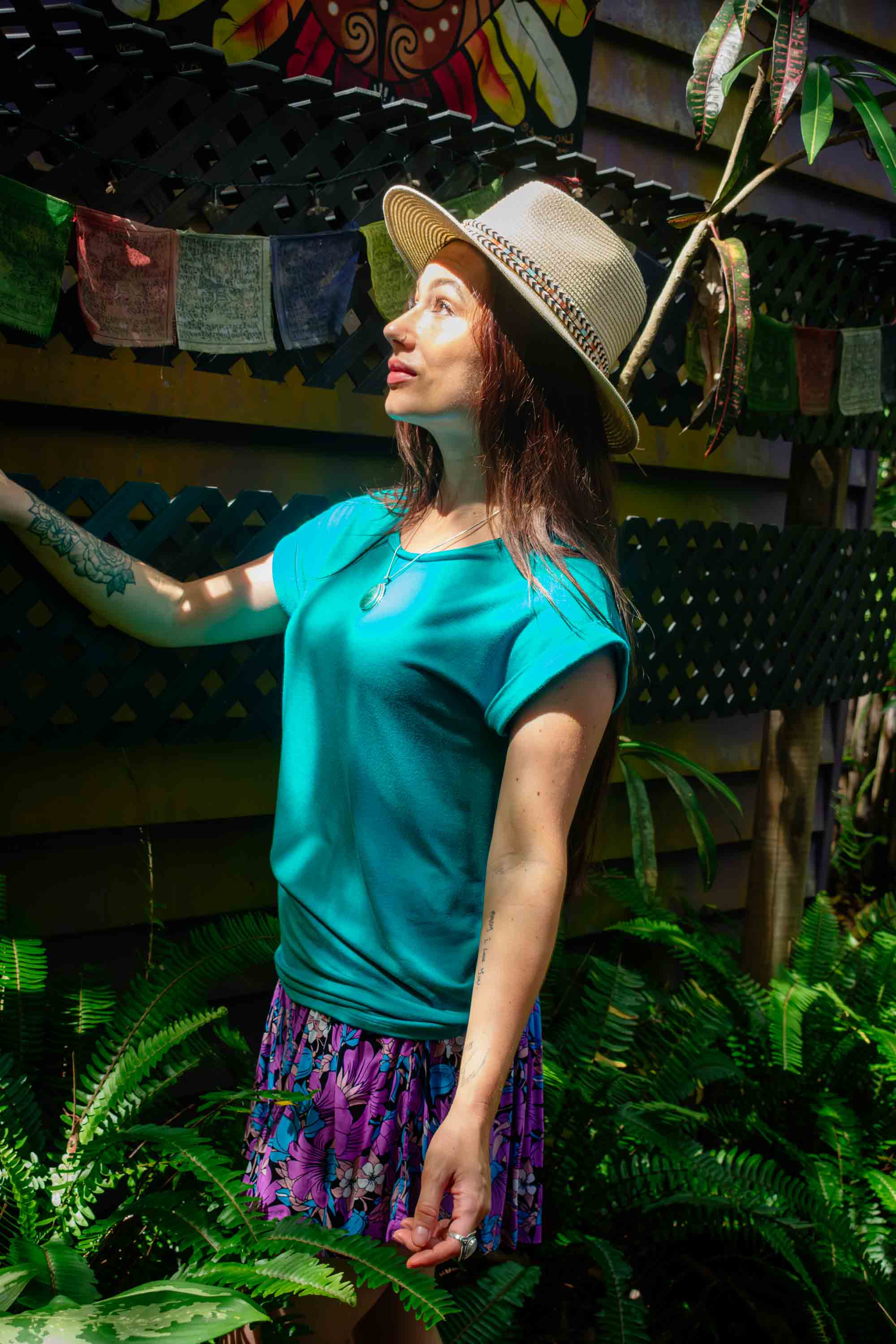 Soft, sleek, and beautifully wearable, our Juniper Top – Sea Green showcases our signature cool, smooth Rayon Blend in a fresh, contemporary silhouette. With its cuffed short sleeve, generous hemline, and flattering high round neckline, this modern twist on a classic T-shirt offers breathable comfort, gentle stretch, and easy versatility. Designed to suit many shapes and styles, it pairs effortlessly with skirts, denim, or relaxed summer pants. A flexible everyday staple and a timeless wardrobe addition in a calming Sea Green.
