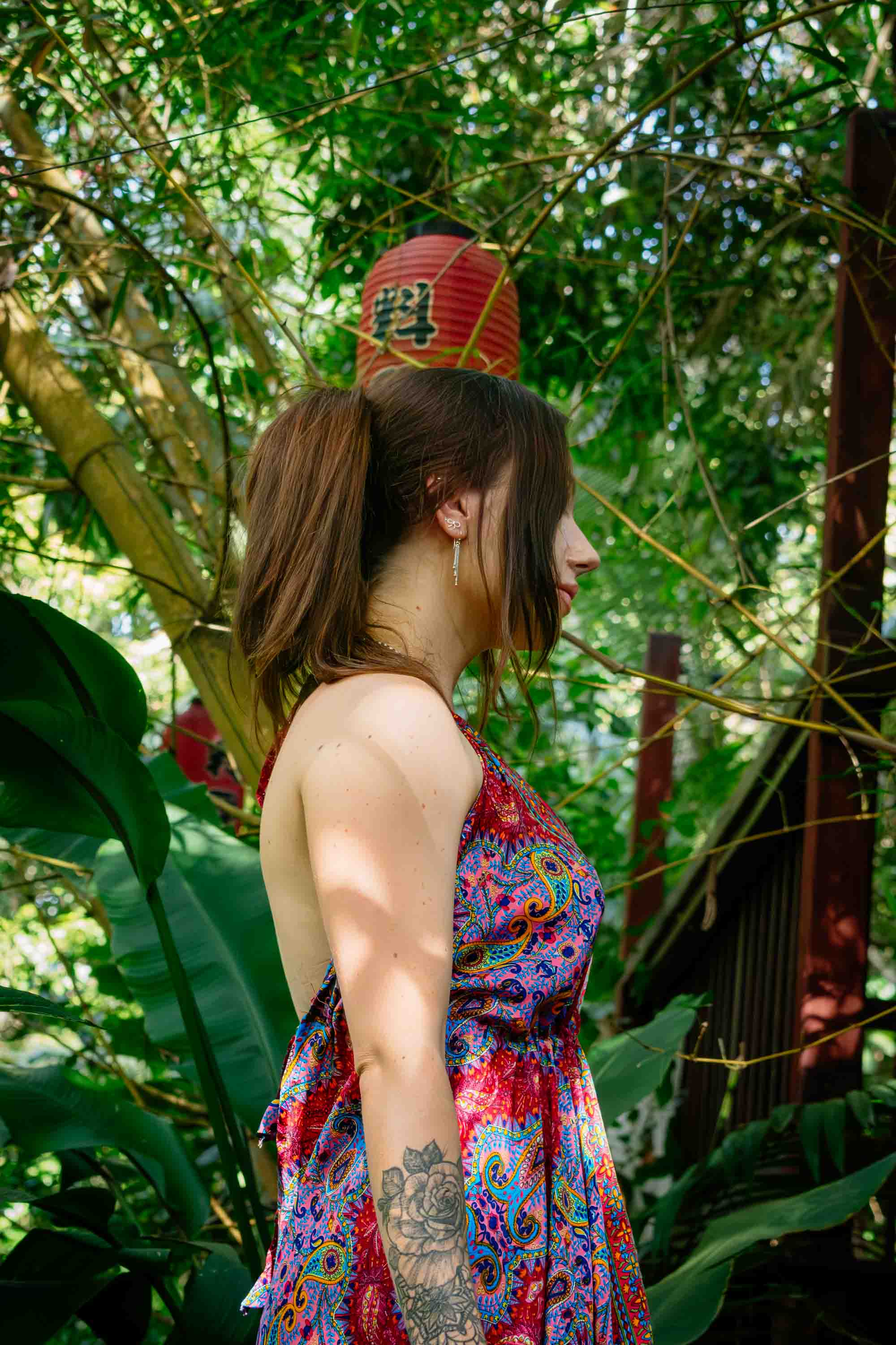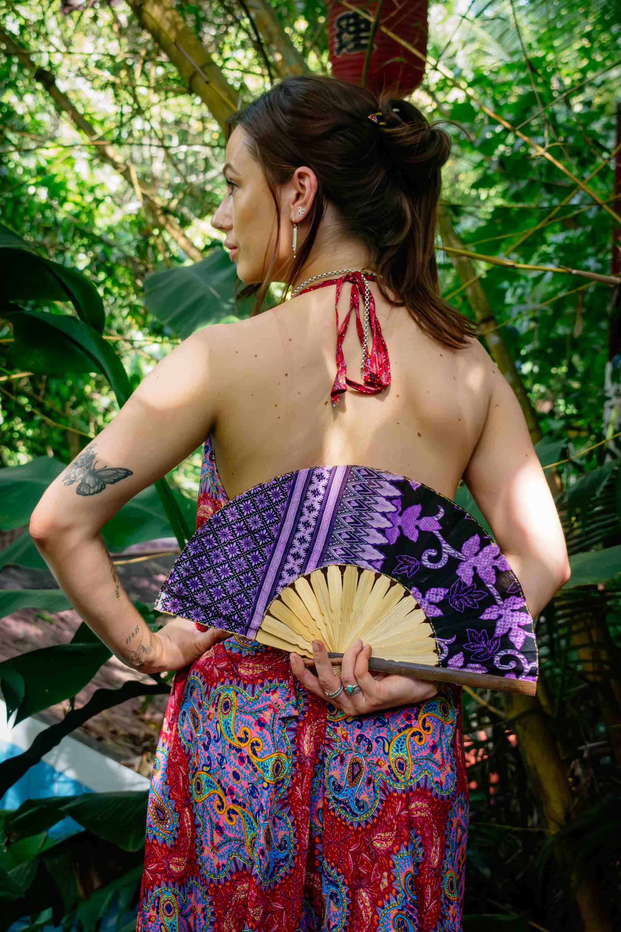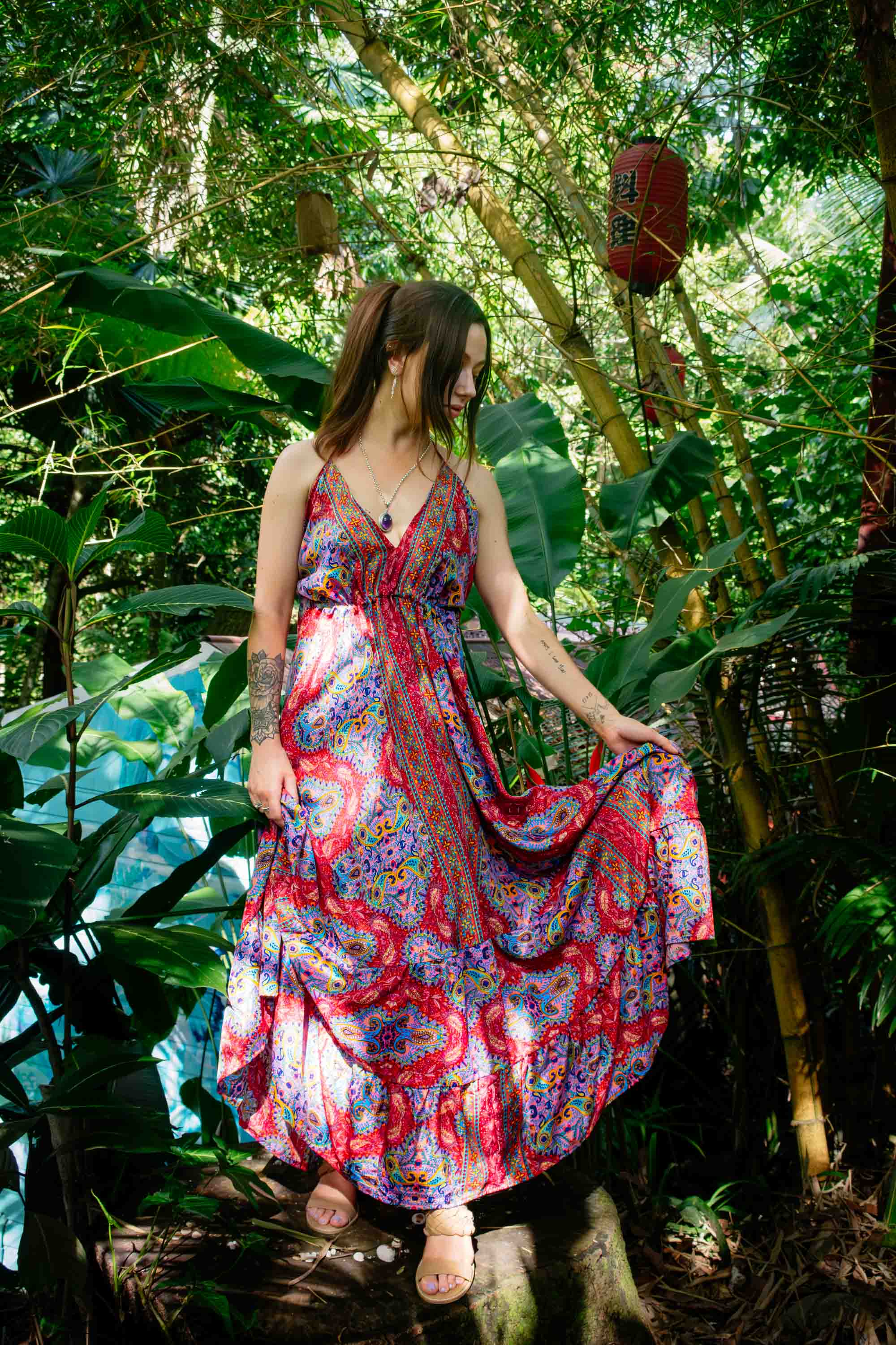 Striking, flowing, and full of bohemian magic, our Shilo Maxi Dress – Auburn brings a dramatic yet feminine touch to warm-weather styling. The rich Auburn base sets the tone for its beautiful paisley pattern, highlighted with expressive Purple and Blue detailing for a captivating colour contrast. Crafted from cool, silky Viscose, this backless gown features an adjustable halter neckline, tie waist, and a voluminous tiered maxi skirt for elegant movement. Flattering, flexible, and effortlessly eye-catching, it’s the perfect piece for summer evenings, holidays, and special boho moments.