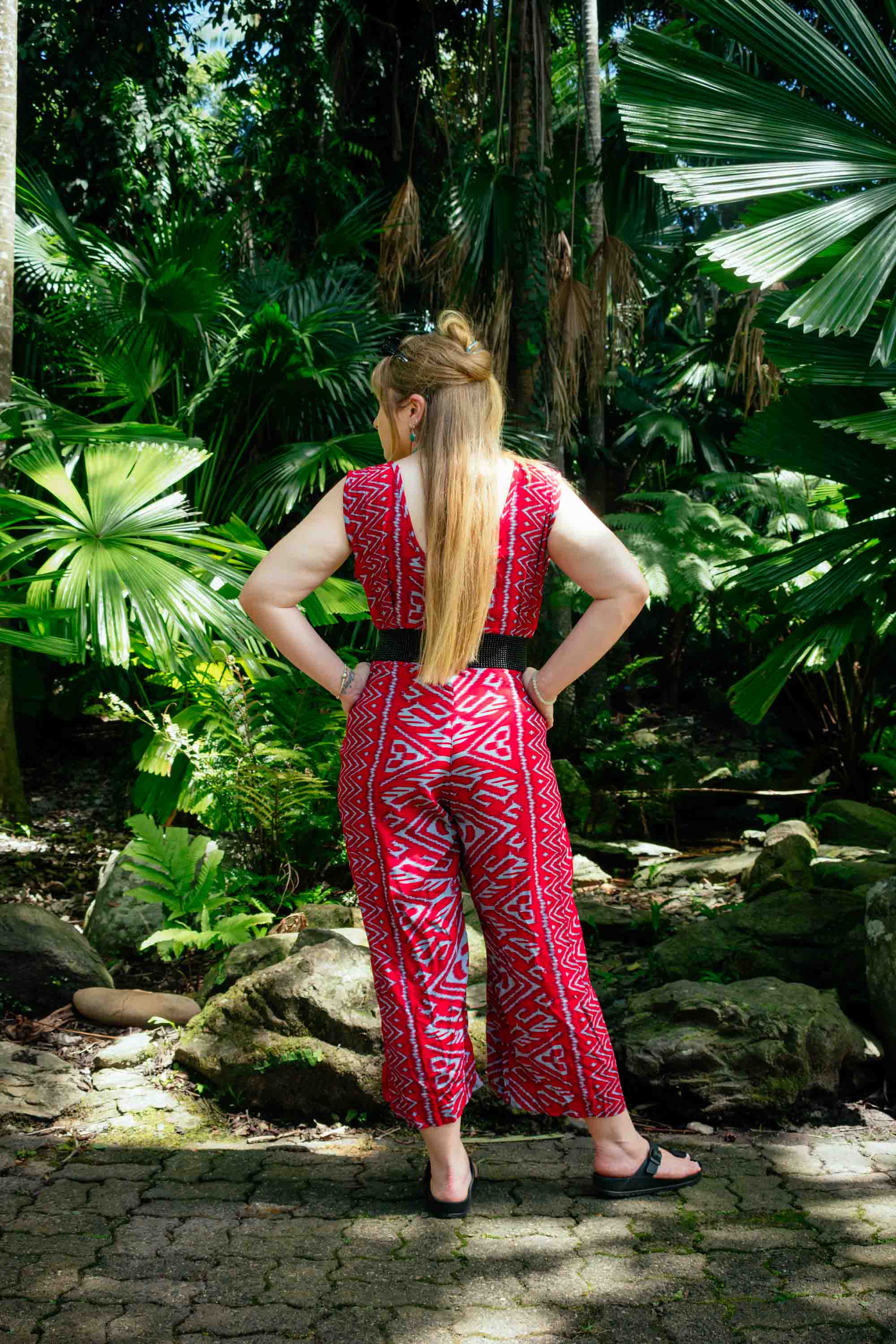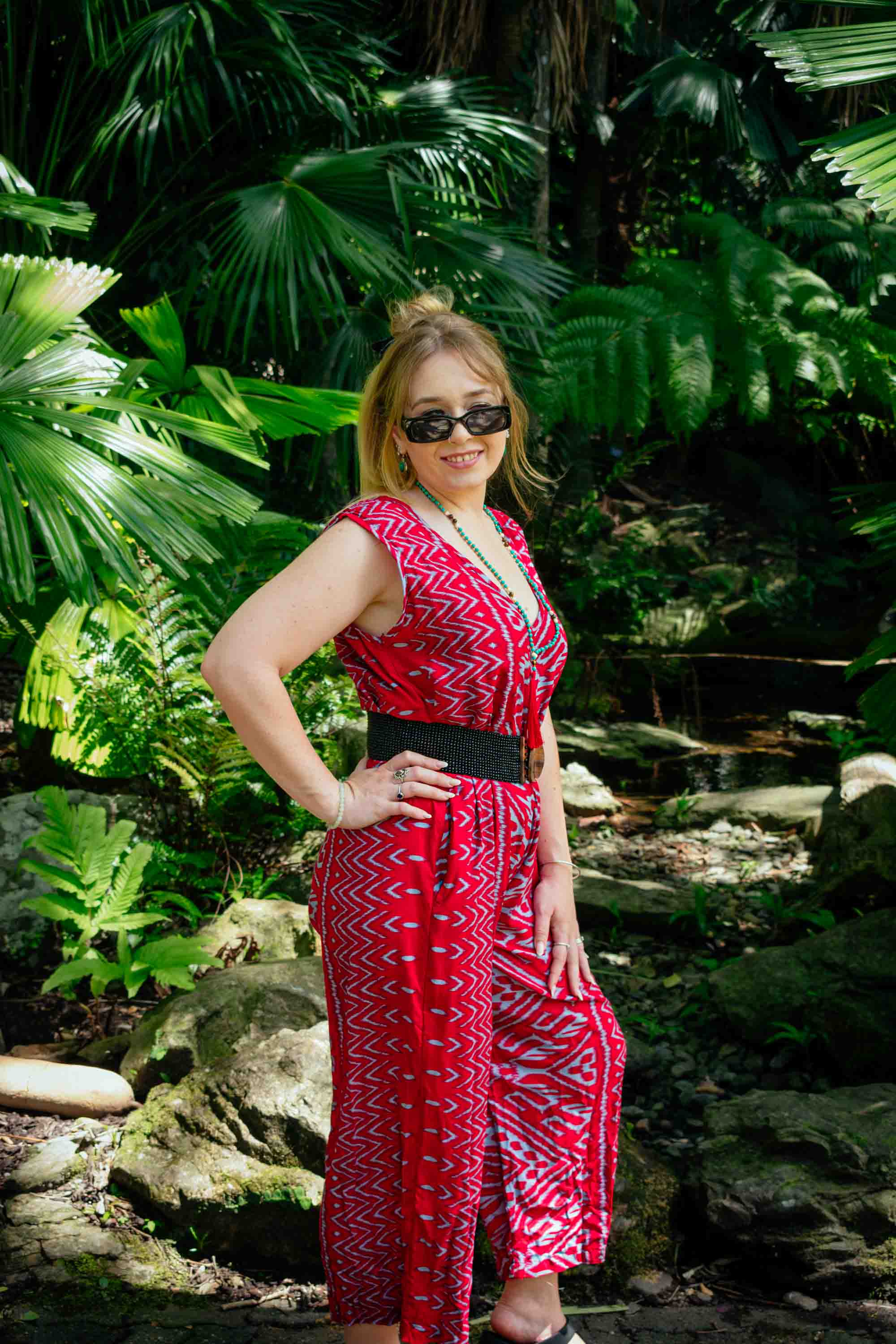 Bold, confident, and beautifully expressive, our Tamarind Jumpsuit – Aztec Red brings vibrant energy to a sleek, flattering silhouette. The striking geometric print in rich Red tones creates a strong visual impact while the linear design enhances and elongates the body. Crafted from cool, lightweight Rayon, this jumpsuit feels breathable, soft, and effortless to wear, finished with practical pockets for everyday comfort. Style it with statement accessories, wedges, or a belt for festivals, garden parties, or standout summer moments.
